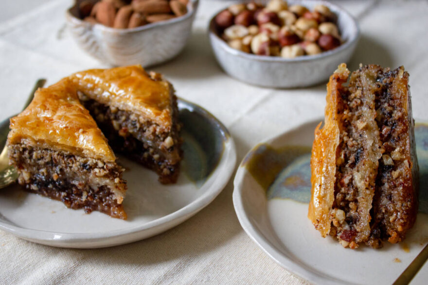 Eine der (vielen) historischen Theorien rund um Baklava besagt, dass diese Kunst der osmanischen Konditorei bereits im 15. Jahrhundert ins Habsburger-Reich gelangte, dort zur Herstellung von Strudel angepasst und mit österreichisch-ungarischen Konditortechniken und -vorlieben verschmolzen wurde. Eine andere Theorie ist, dass es Balkanköche waren (die wiederum von den Palastküchen in Istanbul beeinflusst waren), die die Kunst des Baklava-Gebäcks an die österreichisch-ungarischen Höfe brachten. Was auch immer die Wahrheit sein mag, Baklava ist sowohl in der Levante als auch auf dem Balkan allgemein beliebt und es gibt viele, viele Variationen davon. Auf dem Balkan wird Baklava normalerweise aus Walnüssen hergestellt, aber jede Kombination von Nüssen wie unseren Mandeln und Haselnüssen funktioniert wunderbar.