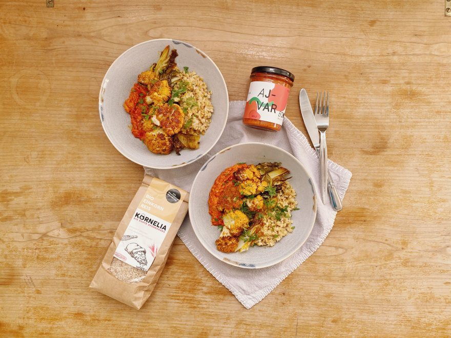 Wir haben uns schon am Karfiol versucht und dieses wunderbare Ajvar-Pesto dazu gegessen. Das war die Vorspeise, sozusagen. Im folgenden Rezept wird der Karfiol, oder Blumenkohl, mit Einkornreis und Ajvar zur Hauptspeise. Das Rezept stammt von Kornelia, die wunderbare Produkte aus Urkorn herstellen – unter anderem den Einkornreis.