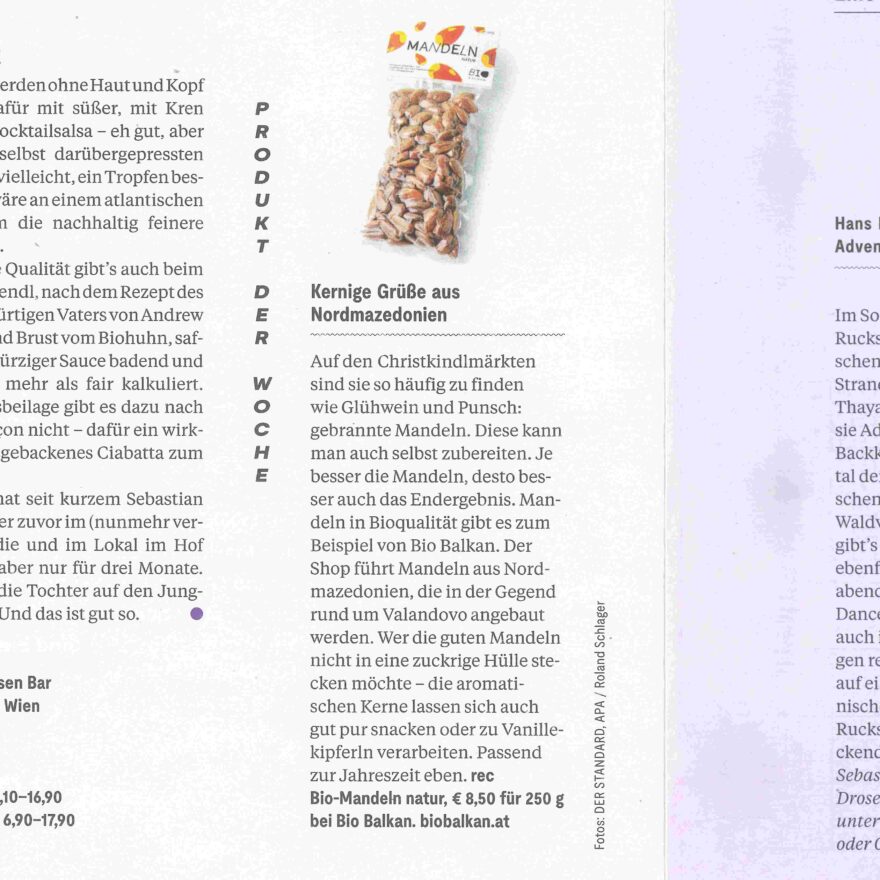 Kaum waren sie geliefert, unsere Bio Mandeln aus Mazedonien, schon wurden sie zum Produkt der Woche in der Beilage Rondo der Tageszeitung Der Standard erkoren. „Passend zur Jahreszeit eben“, so das Urteil, gut für gebrannte Mandeln, aber „die aromatischen Kerne lassen sich auch gut pur snacken oder zu Vanillekipferln verarbeiten.“