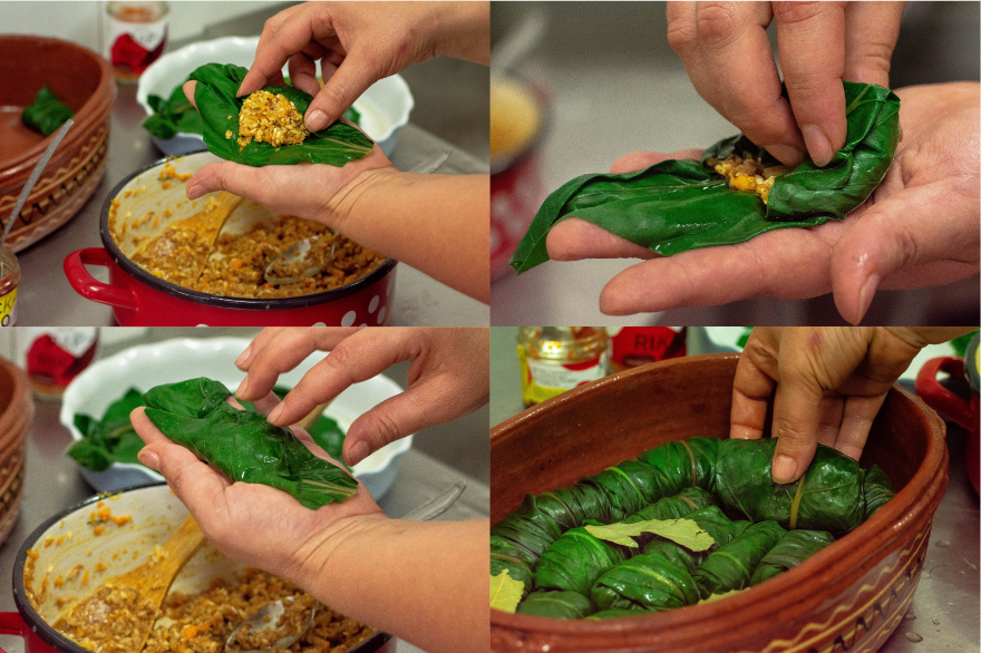 Vierter Schritt: Je eine Handvoll von der Füllung in ein Mangold-Blatt einschlagen. Die fertig gerollten Sarme in eine ofenfeste Form schlichten, die Lorbeerblätter hinzufügen und mit etwas Wasser übergießen. Anschließend am Herd bei schwacher Hitze 30 Minuten köcheln.