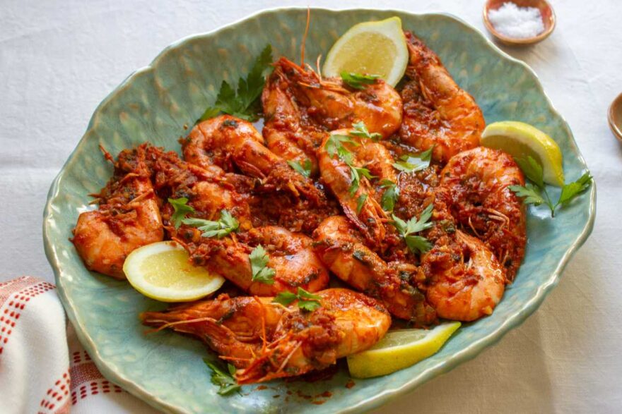 Heute bezieht sich Buzara einfach auf die Zubereitung von Meeresfrüchten – meist Schalentieren – mit einer einfachen, aber umso köstlicheren Soße „auf Weiß“ oder „auf Rot“ (letzteres mit Tomaten). Es gibt verschiedene Methoden der Zubereitung von Scampi Buzara, einschließlich der Zutaten und der Reihenfolge, in der sie verwendet werden. Einige fügen etwa Semmelbrösel hinzu (probieren Sie es aus!), andere lassen die Zwiebel weg, andere wiederum verwenden Essig und Zucker anstelle von Wein. Unser Rezept passt gut zu allen Schalentieren, also auch zu Venusmuscheln oder Miesmuscheln. Sie können also gerne saisonale, frische, regionale oder nachhaltige Meeresfrüchte verwenden. Sie können dieses Rezept natürlich gerne verdoppeln, indem Sie das gesamte Glas Paradajz verbrauchen. Servieren Sie es mit cremiger Polenta oder frischem, knusprigem Brot.