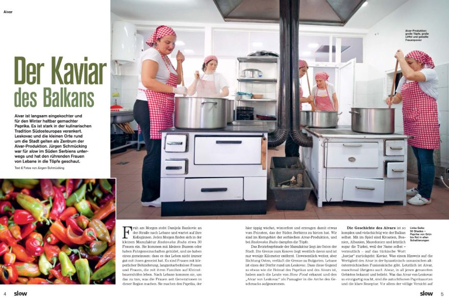 Die traditionelle Paprikapaste Ajvar, so wie sie von unseren Partnern Radanska Ruža zubereitet wird, ist das Slow Food des Balkans. A la Carte, das Magazin für Ess- und Trinkkultur, hat für das Slow Magazin beim Einkochen zugesehen: „Die Geschichte des Ajvars ist so komplex und vielschichtig wie der Balkan selbst. Mit im Spiel sind Kroatien, Bosnien, Albanien, Mazedonien und letztlich sogar die Türkei, weil der Name selbst – vermutlich – auf das türkische Wort „havjar“ zurückgeht: Kaviar. Was einen Hinweis auf die Wertigkeit des Ajvar in der byzantinisch-osmanischen alt-österreichischen Fusionsküche gibt. Letztlich ist Ajvar, manchmal übrigens auch Aiwar, in all jenen genannten Gebieten bekannt und beliebt. Was das Ajvar von Leskovac so einzigartig macht, sind die autochthonen Paprikasorten und die klare Rezeptur. Vor allem der völlige Verzicht auf Tomaten und Auberginen unterscheidet den südserbischen Ajvar von vielen anderen. Und da kennen die Frauen von Radanska Ruža keinen Spaß. Alleine die Frage, ob vielleicht Melanzani im Rezept verwendet werde, wird mit eisigem Blick und einem knappen „ne“ beantwortet.“