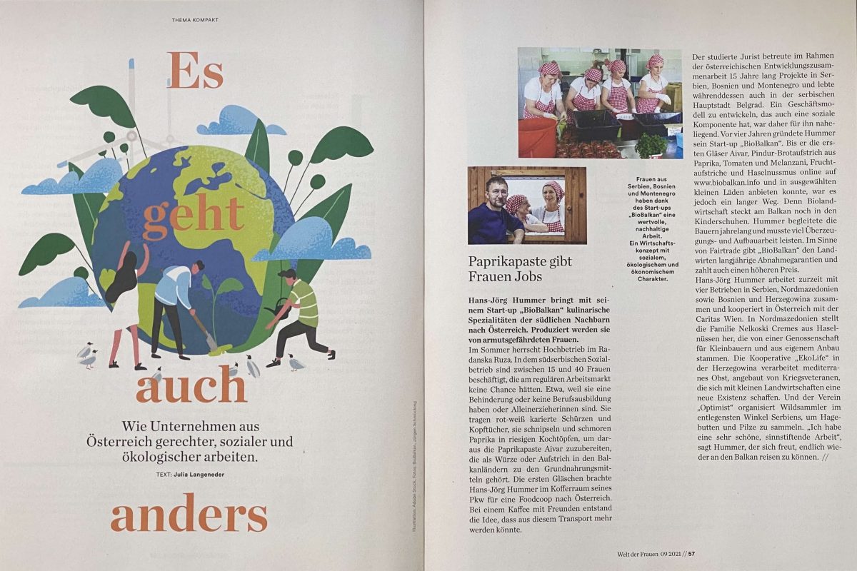 Unter dem Titel „Es geht auch anders“ stellt das Magazin „Welt der Frauen“ BioBalkan als ein „Wirtschaftskonzept mit sozialem, ökologischen und ökonomischen Charakter“ vor. „Hans-Jörg Hummer bringt mit seinem Start-up BioBalkan kulinarische Spezialitäten der südlichen Nachbarn nach Österreich. Produziert werden sie von armutsgefährdeten Frauen.“