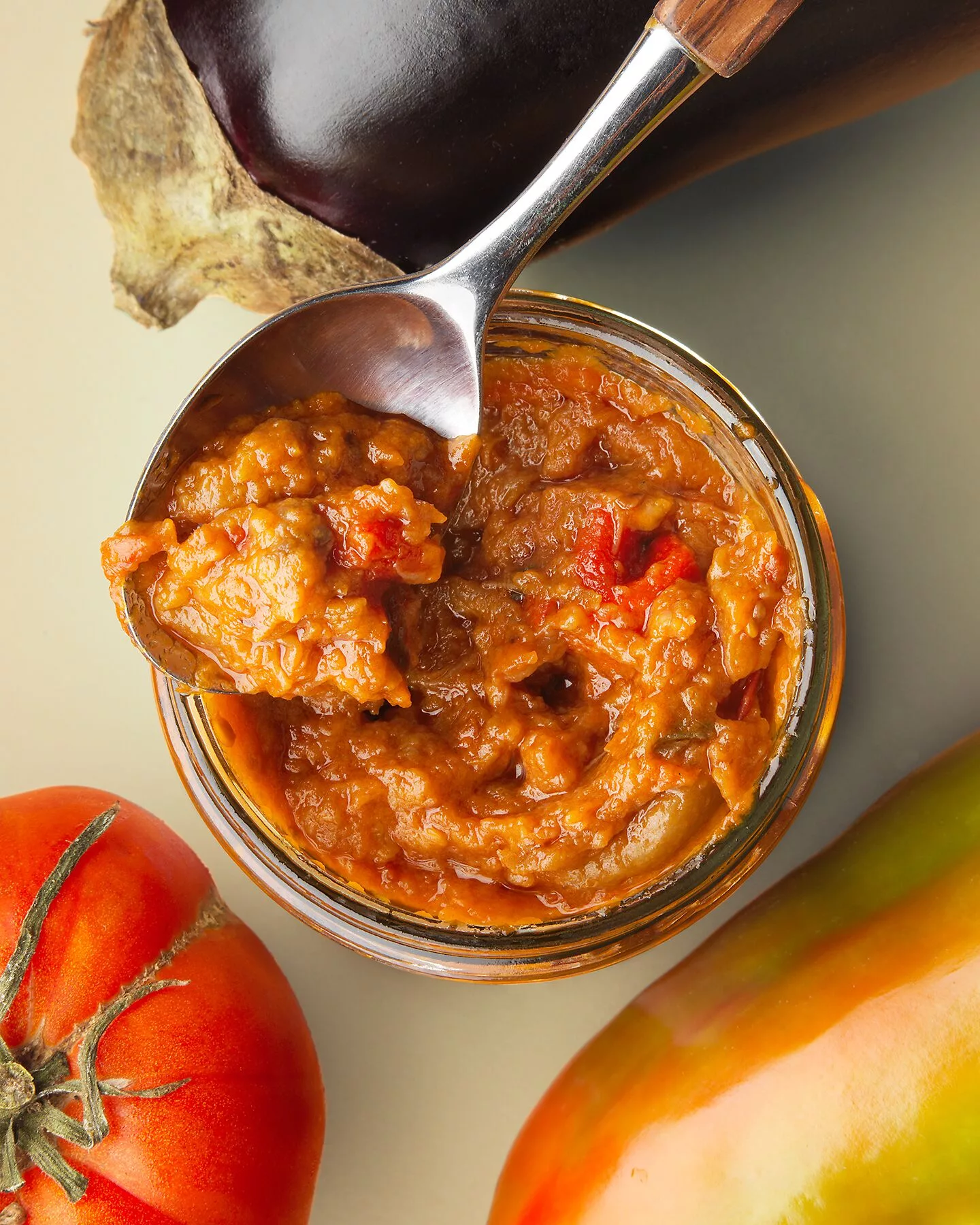 Herrlich fruchtiger Aufstrich aus bunten Spitzpaprika, Auberginen und Tomaten, in Handarbeit am Holzherd geröstet und eingekocht. Jetzt noch cremiger!